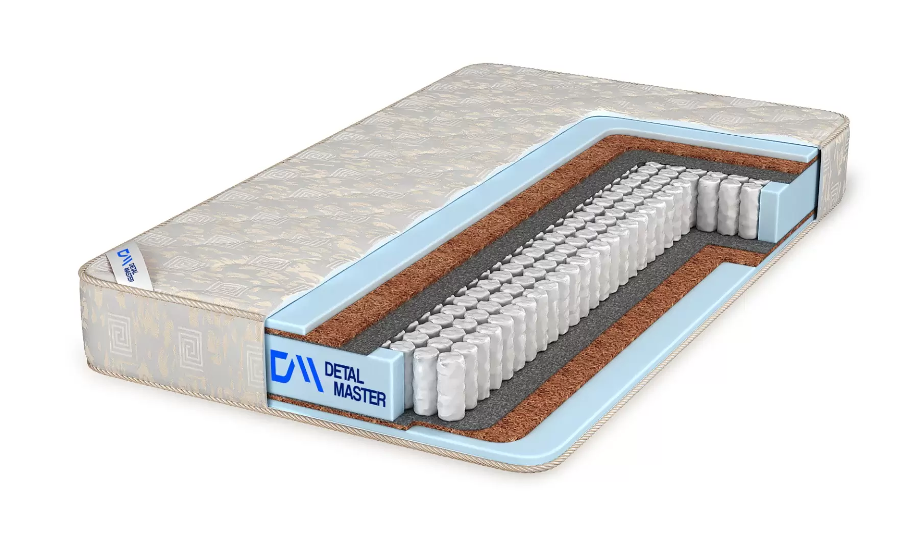 Модель имеет два наполнителя. Ближе к поверхности расположен искусственный латекс ППУ. Это эластичный и прочный материал. Его поверхность повторяет контуры тела и помогает человеку полностью расслабиться. Вторым наполнителем является кокос. Это жесткий от природы материал. Он хорошо пропускает воздух и дополняет ортопедические свойства конструкции. Основа покрыта слоем войлока. Прочный материал защищает наполнители от механических повреждений о пружинный блок.