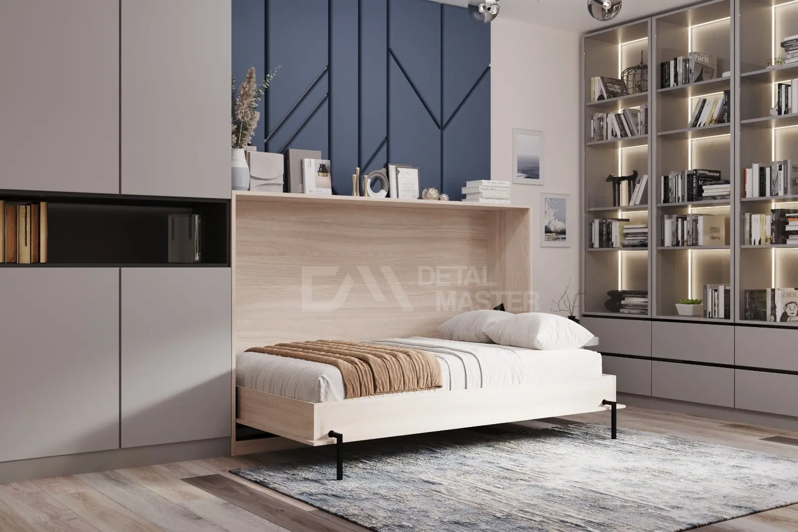Горизонтальная шкаф-кровать "Solo Start".  Работает на механизме раскладывания собственной разработки "Start". Кровать раскладывается легким движением руки, превращаясь в полноценное спальное место. Просто потяните ее за ручки, расположенные на фасаде и выставите ножки-опоры.